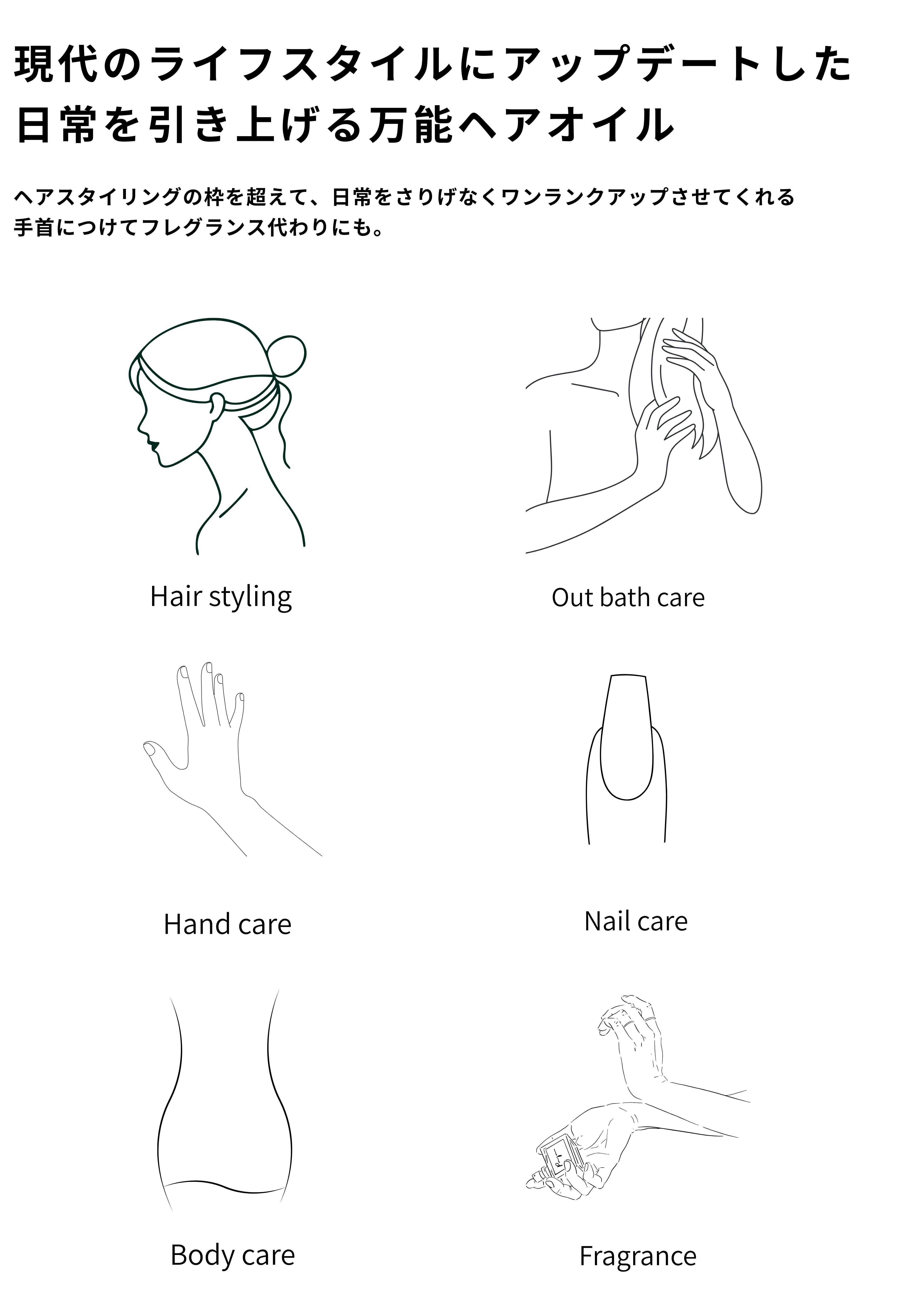 朝はヘアスタイリングとして、日中はハンドやネイルオイル、夜はアウトバストリートメントやボディケアとしても可能。